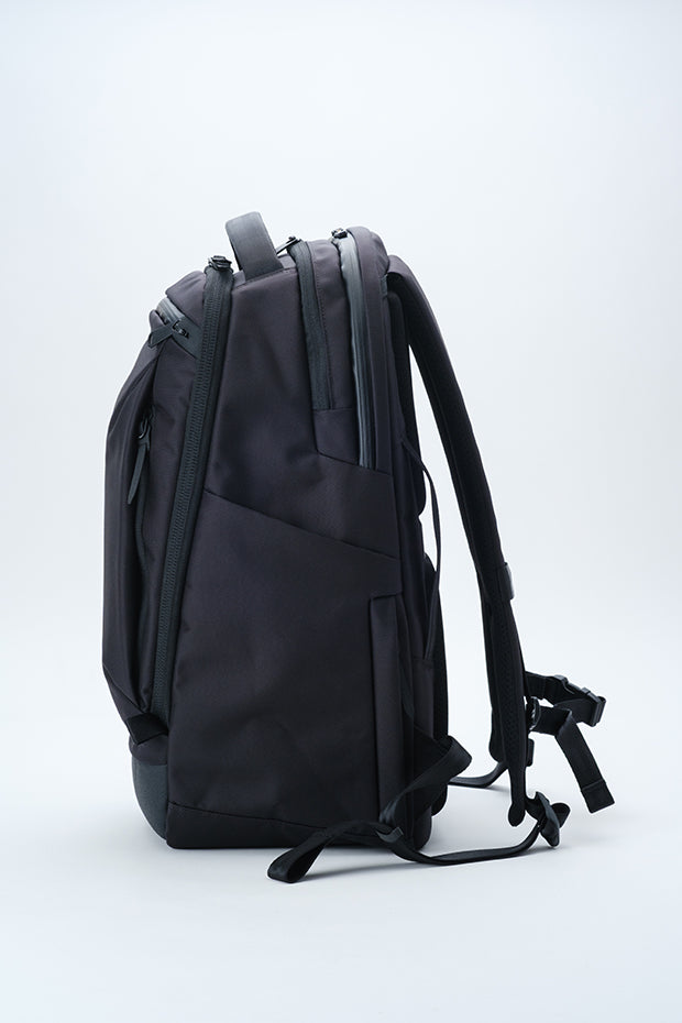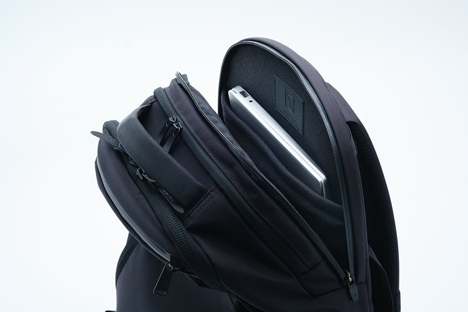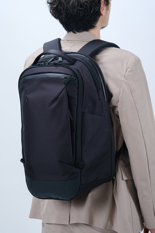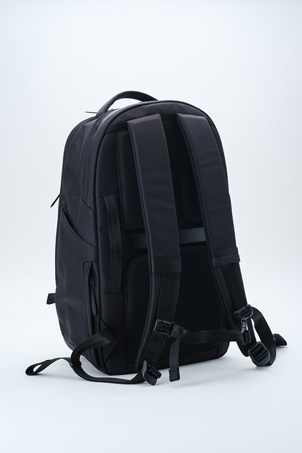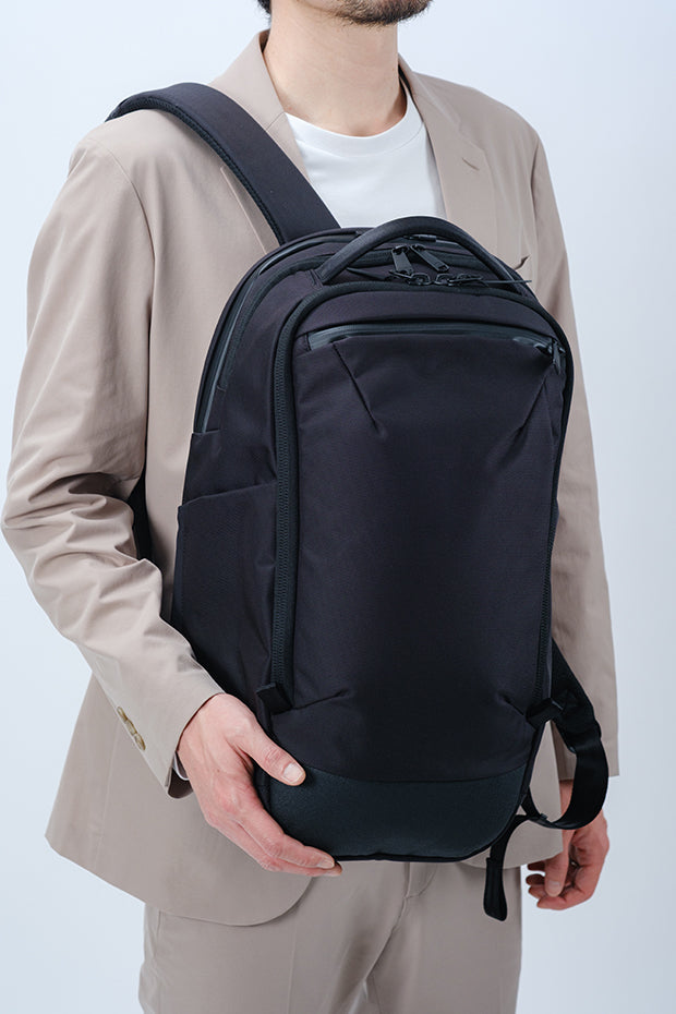 「通勤中の突然の雨にも、長時間の移動にも、出張にも。考え抜かれた収納と圧倒的な耐水性で、あなたのビジネスライフを支える全天候型バックパック」
