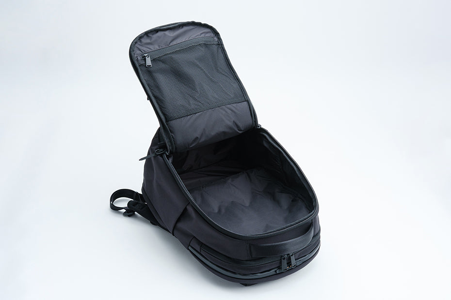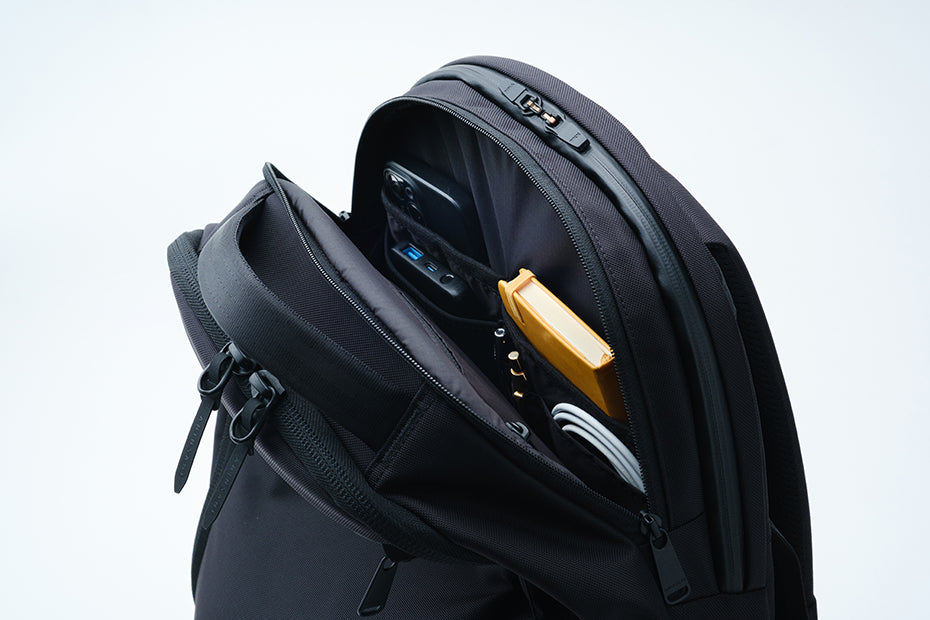 さらにルーム内前面に大型のジッパーポケットも配置。かさばる充電ケーブルやマウスも収納可能です。ガジェットルームを身体側に配置し、重心を内側へ向ける事で、重い荷物でも後ろに引っ張られにくく、体への負担を軽減します。