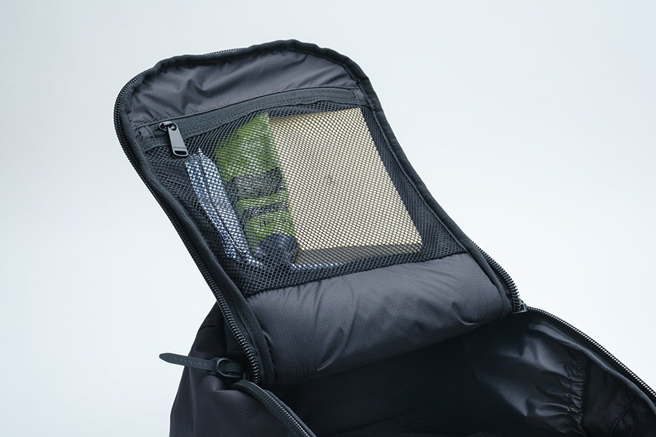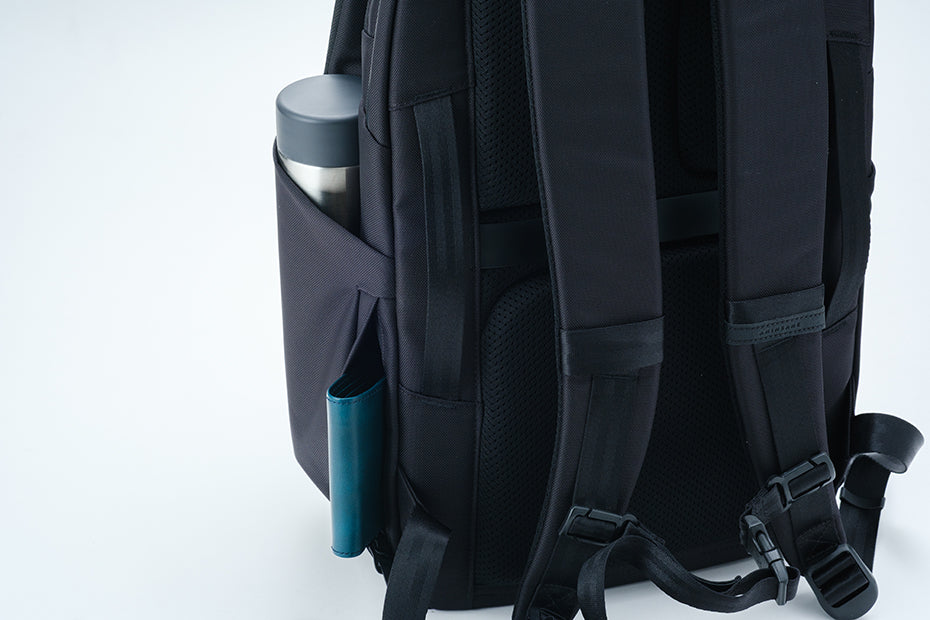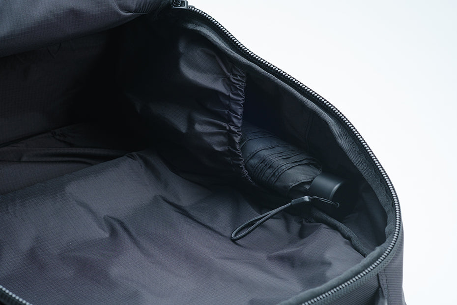 折り畳み傘を立て収納出来るナローポケットも配置。ビジネスシーンでドリンクを外側ポケットに出したくないときの収納にもおすすめです。メインルーム前面には中空メッシュポケットを配置。細かな荷物を底にためず、バッグの中で見失う事を防ぎます。