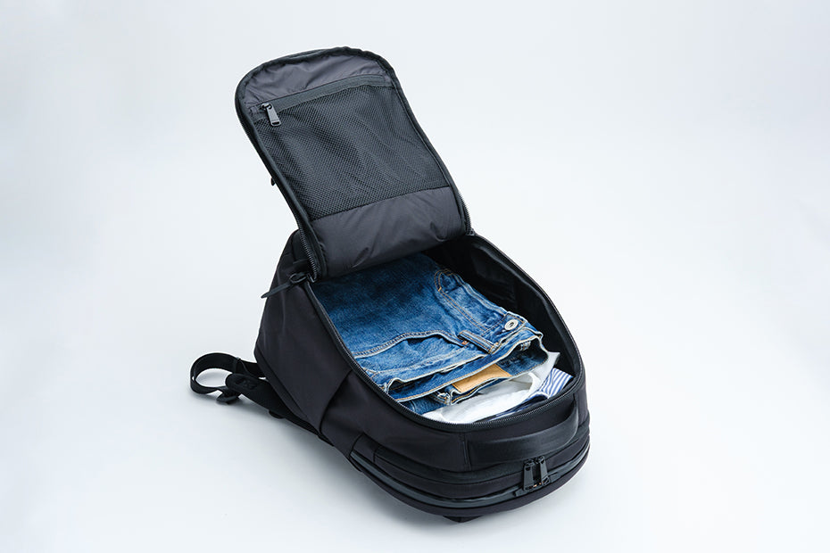 メインルームは本体開口が大きく開く事により荷物の出し入れがしやすいです。出張時には着替えやお土産、デイリーには書類や資料をたっぷりと収納できます。