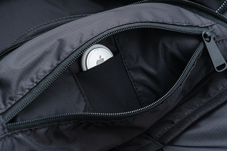 そしてこちらのジッパーポケットには隠しポケットが配置されており、エアタグなどを入れる事により紛失時、バッグを探すことにも役立ちます。もちろんAサイズ書類も収納可能です。