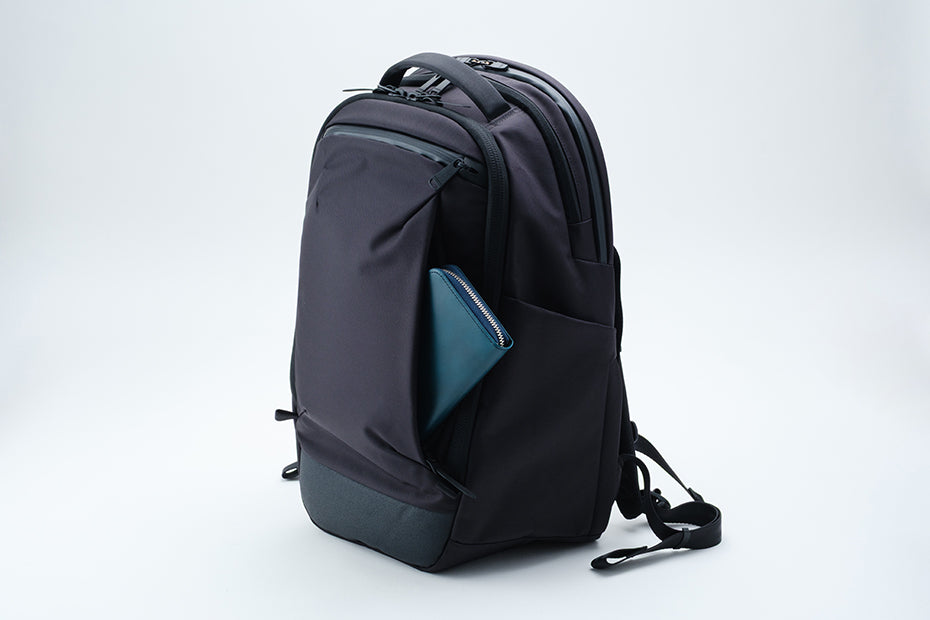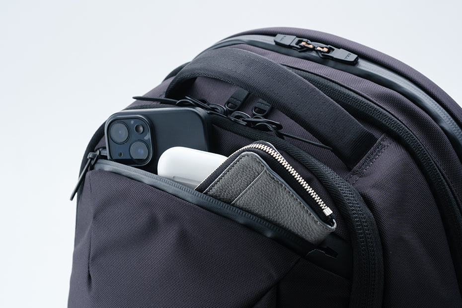 正面から右手にはサイドジッパーポケットを配置。毎日使うパスケースなどの収納に最適です。こちらのポケットはボトルを入れた状態でも荷物同士が干渉せずスムーズに出し入れが出来るよう工夫された設計になっています。