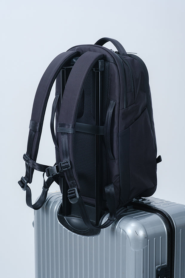 背面のテープによりキャリーオンも可能です。キャリーオン時、直立を保てることにより空港カウンターなどでも荷物が取り出しやすくなります。また背面にはちょい持ち出来るハンドルも完備。適度な通気性を生むブロックパッドも快適な背負い心地を生み出します。