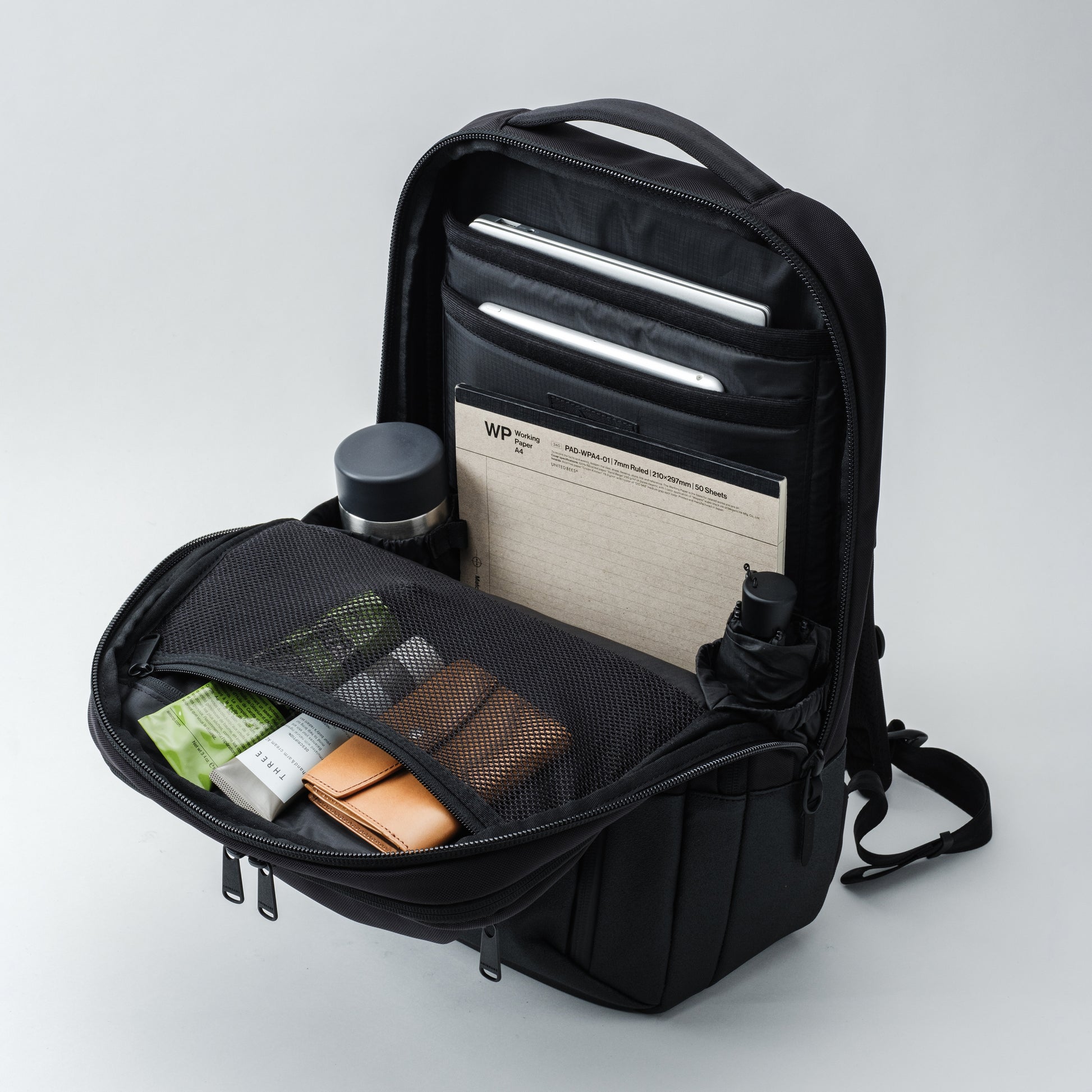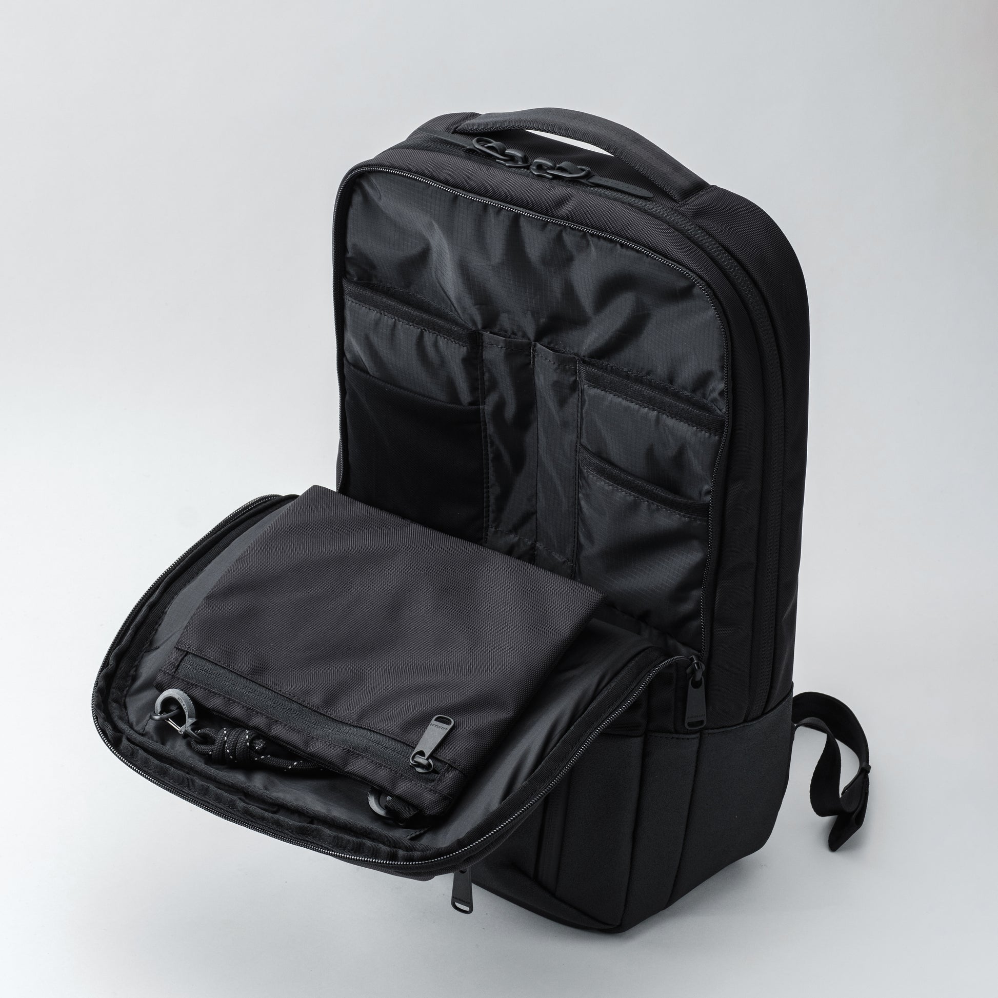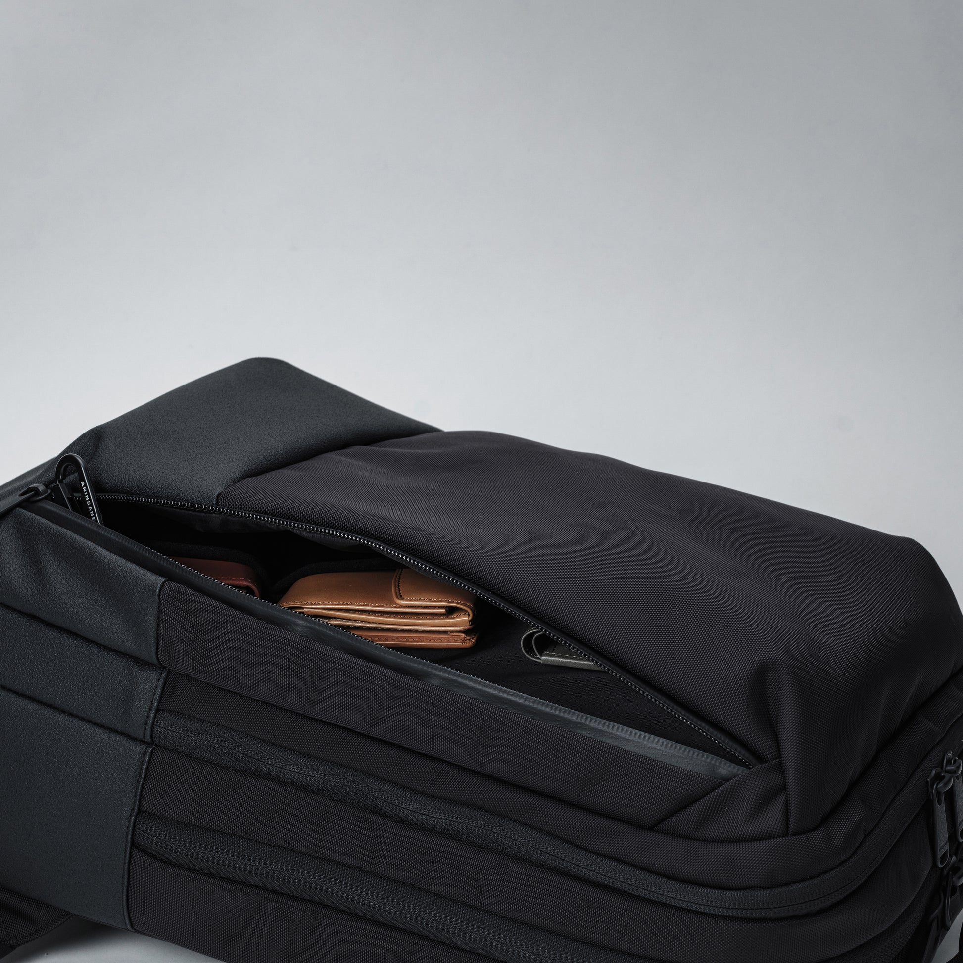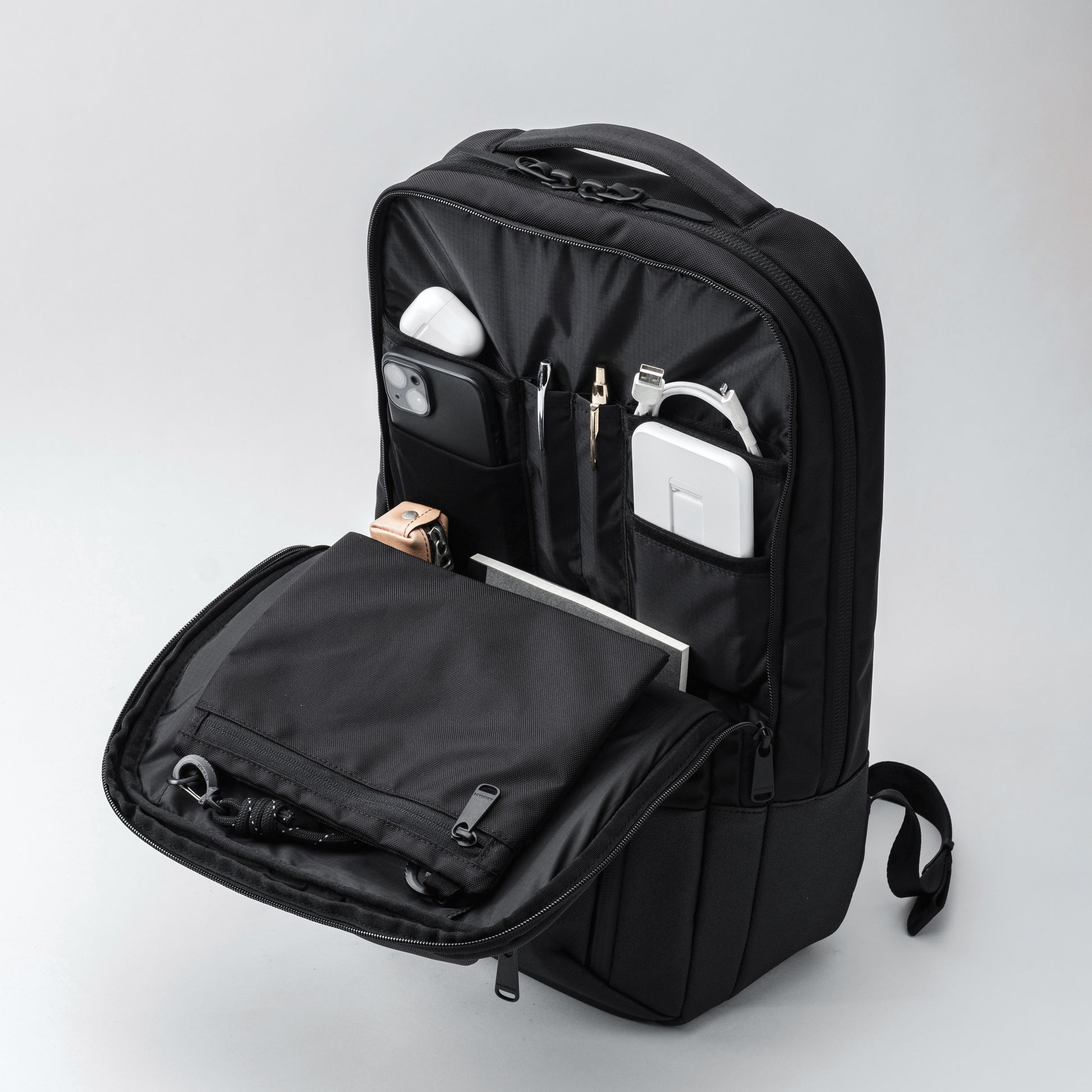 メインルーム、サブルーム、メインポケット、サブポケットと豊富かつ機能的な収納能力。ビジネスマンが持ち歩くアイテムをリサーチしたうえで、何をどこにしまうか。十分な容量を確保しながら適切な位置が計算しつくされた収納配置を設計しました。