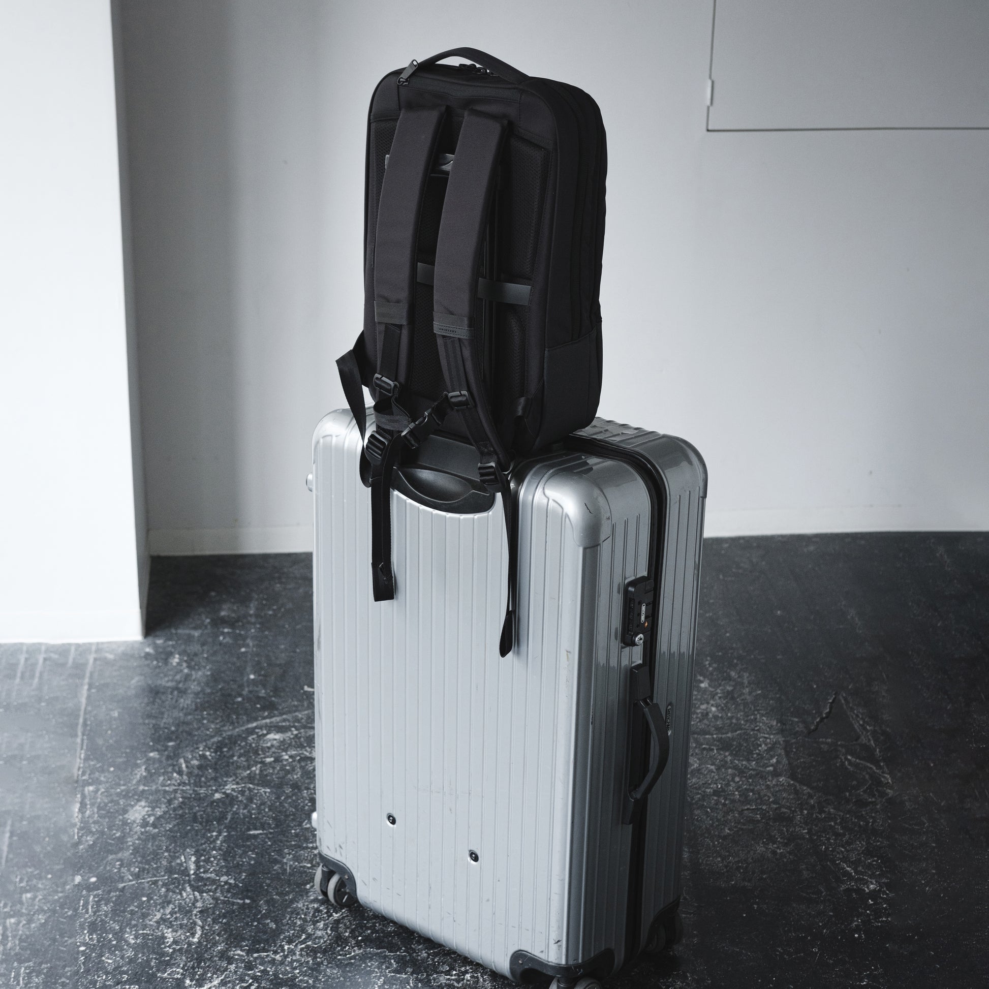 背面のテープによりキャリーオンも可能です。キャリーオン時、直立を保てることにより空港カウンターなどでも荷物が取り出しやすくなります。