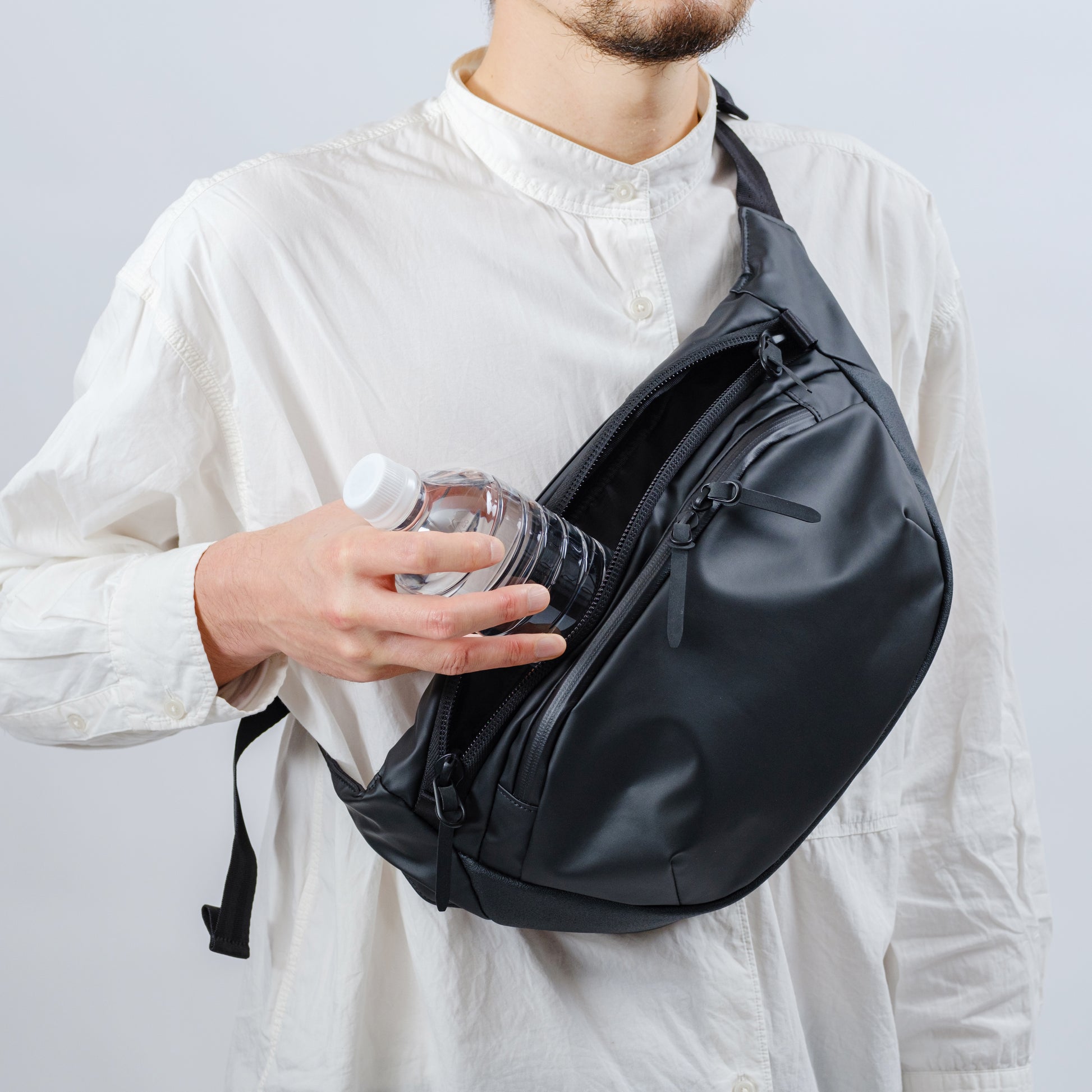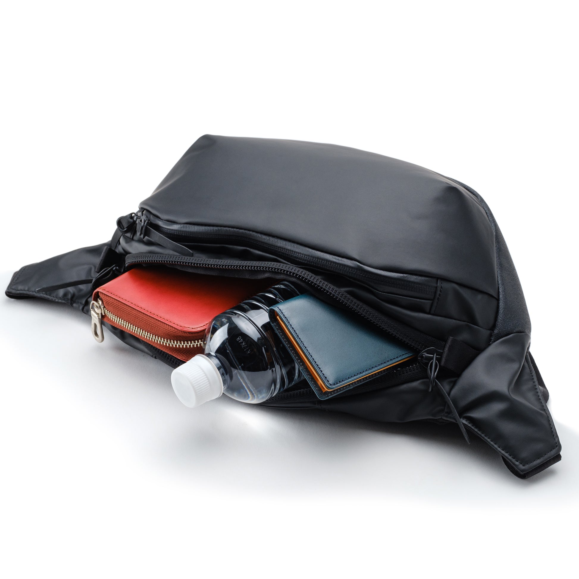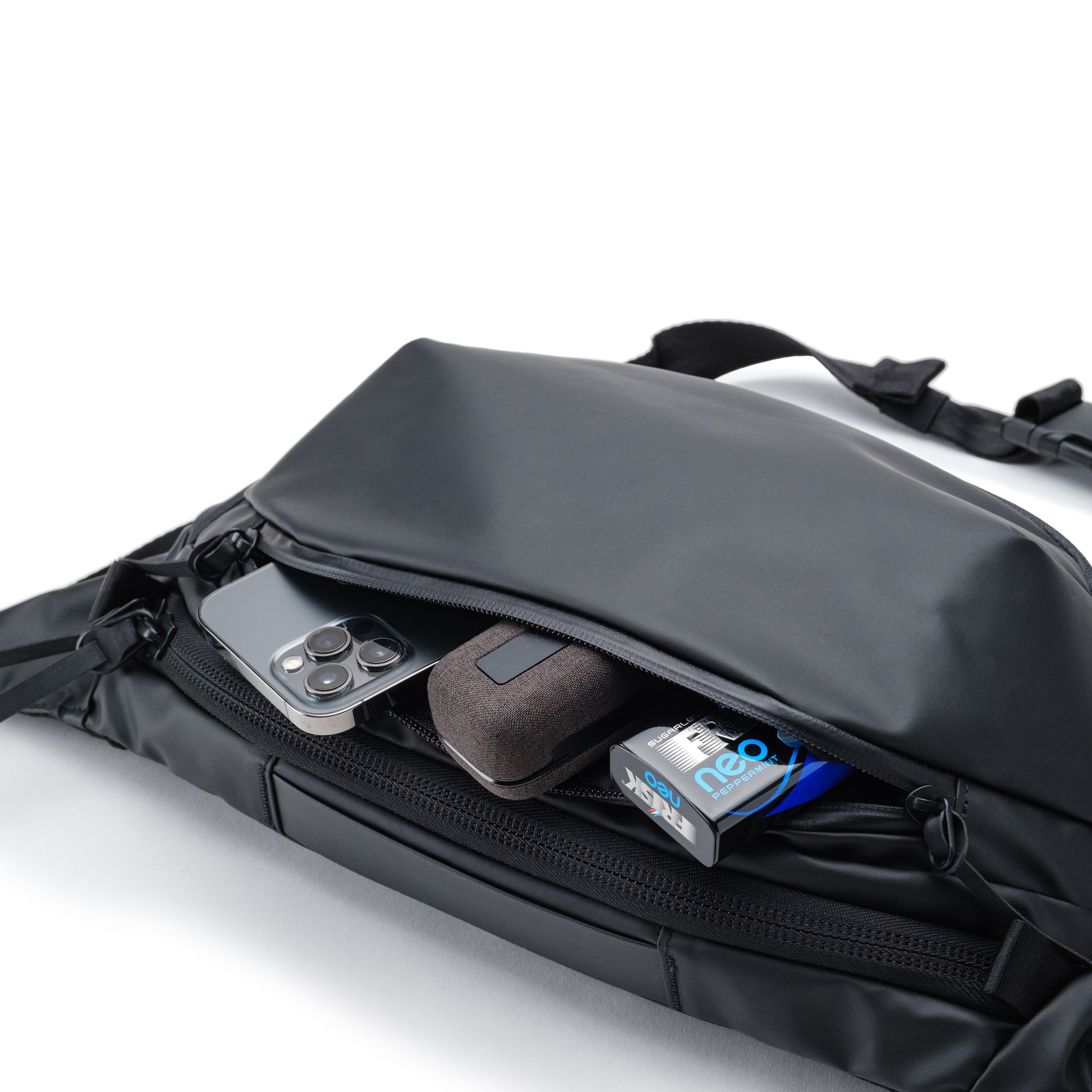フロント収納にはYKK止水ファスナーを使用。携帯やワイヤレスイヤホンなどのガジェット類を雨や汚れから守ります。収納力も十分に確保、文庫本や500mmペットボトルも収納可能です。