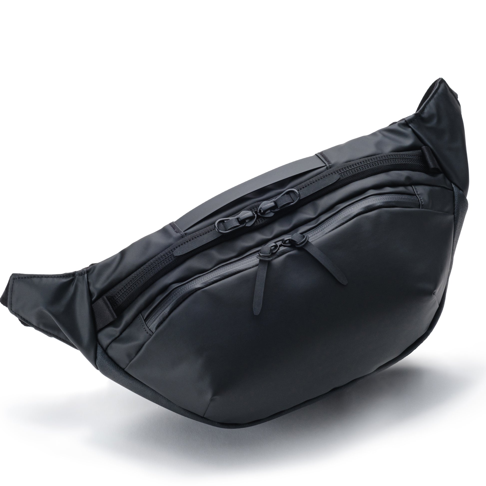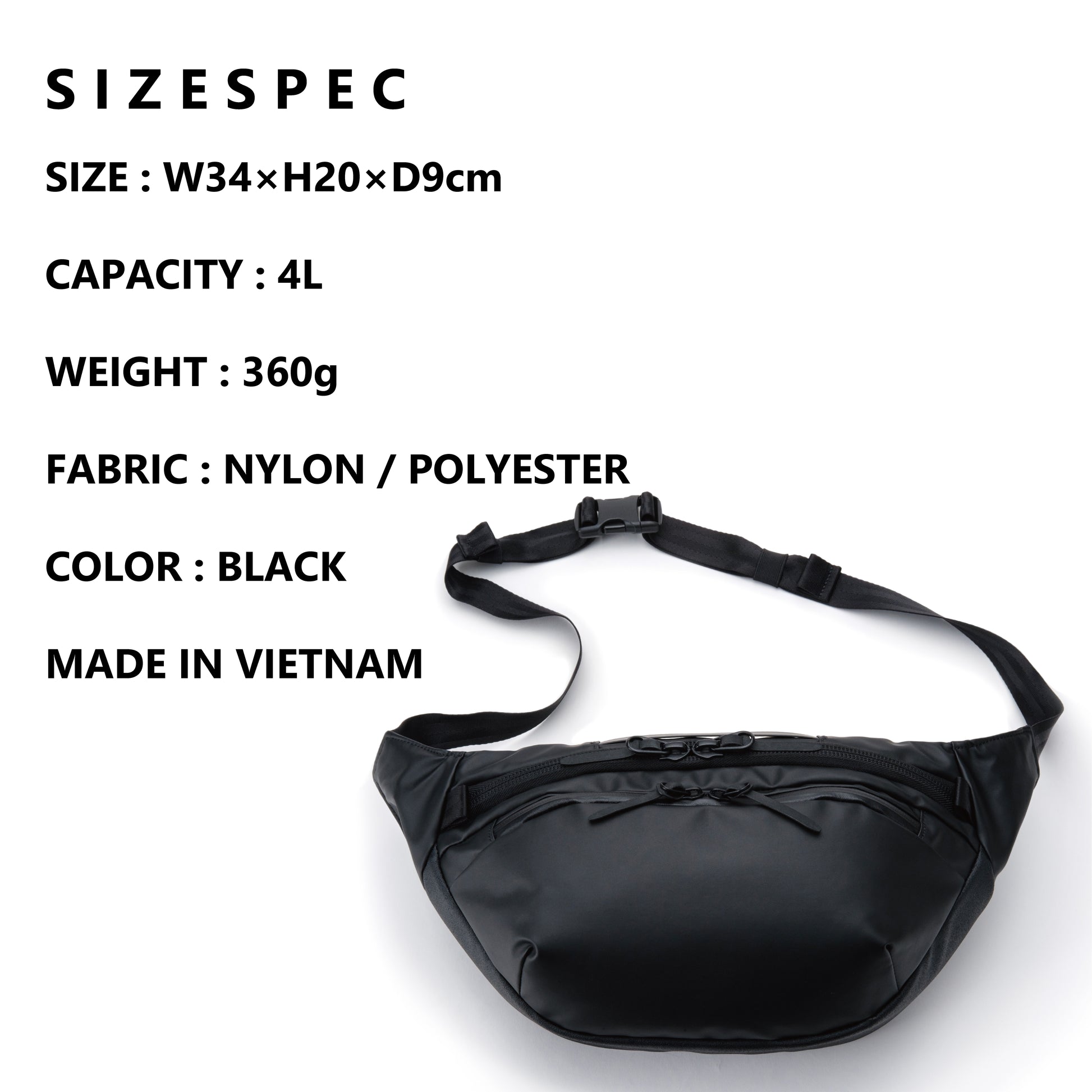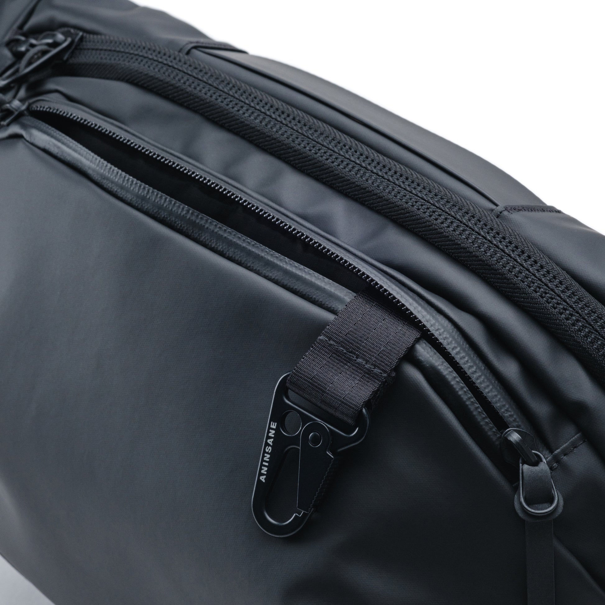 フロント収納にはYKK止水ファスナーを使用。携帯やワイヤレスイヤホンなどのガジェット類を雨や汚れから守ります。収納力も十分に確保、文庫本や500mmペットボトルも収納可能です。