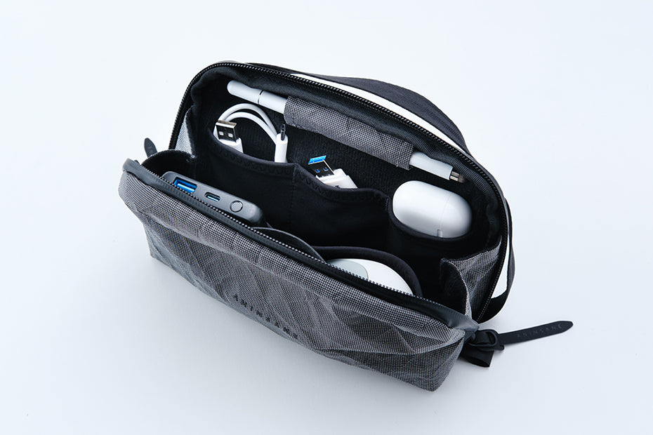 ストレッチポケットやペンホルダーで、ガジェットからメイク道具までしっかり整理。世界最強クラスの繊維“ULTRA™ 100X”を使用した、超軽量で高耐水のマルチポーチ。